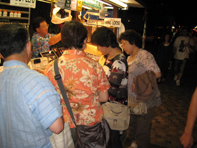 ダイアモンドヘッドは いかがだったでしょうか?(^◇^) 5日目最終日、本当は ホテルから近い サンセイ・シーフード・レストラン 行きたかったんですが、予約もしてなかったし 日曜の6時では30分待ち・・・。 もうちょっと早くホテル出れば良かったです。 チーズケーキファクトリーなんて 金曜でも5時半ごろだったから 10分待ちでOKでした。 それで去年も行った お寿司屋の「RUN」です。 店内はこんな感じ。回転もしてますが うちらはセットで。 まあ味はハワイですから、まあ・・・でしょう。 私の母は生魚だめなんでここでも 大好きなそば食べてご満悦でした。 でもえびやかには食べれるんですがね、なぜか? 外はもう真っ暗な、カラカウア通り。 この時間帯になると、ほんと 「ああ、明日ほんとに帰るんだなぁ」と しみじみ思い、本当に嫌になりますね。 最後にまた大好きな デユーク像向いのお土産店へ。 ここは小物や、私の大好きな看板が 沢山あっていいですよ。 (写真クリックするとエラーに ならなければ大きくなります) クリックして大きくなればわかると 思うのですが、プレスリーの ブルーハワイの看板、実は これもほしかったけど、その前に 沢山買ったしね、諦めたけど やっぱちょっと悔いが残るなぁ・・・。 この時もちょっと小雨降っていて ほんと綺麗に晴れたのは 昼間の散策の時くらいでしたね。 そしてついに帰国日朝、ラナイから・・・・。 クアロアランチOPツアーのTシャツを着た俺! 4日目くらいからだんだんと天気よくなってきて まったく今回のハワイはずるいよ~って 感じでしたね。初日なんて(旅行記では 相当昔ですが・・・)思いっきり雨、 2日目も雨で、まったくハワイに馬鹿に されているようで「何、また来たのかい?」ってね。 そうして最後の方に行くに連れて晴れてきて 大好きなハワイ見せてくれて、今度は 「来年、また当然来るんだろう?」って 言われているようでした。(^◇^) いつもは帰国日朝は、ABCで軽く済ませるんですが 今回は親の大スポンサーが居て、食費も助かったんで 朝4時からやっている ルルズ・ワイキキ・サーフクラブに 7時半頃行きました。 1回の旅で同じお店に二度も行くのも 今回が初めてでしたね。 それくらい大好きなお店。今度は夜行ってみたいです。 ハワイ島コナにもあるしね、来年はそっちかな? では、次回は帰国日朝、ハワイ最後の食事編でーす。 このときルルズのオリジナルシャツ大発見!! クアロアランチOPツアーと同じくらい 嬉しい発見でした、お楽しみに。 あと、食事のあとは当然最後の見納め ビーチに行きます。この時も写真いつも 撮りまくるんで、まだ写真50枚くらいあるんで 旅行記もあと5~6話つづきま~す、 もうちょっとお付き合いよろしくです。(●^o^●) ポリスに捕まったわけではありません(^_^;) ホテルへの帰り道。 そしてツアーランジに 明日の帰国便の確認行った時 ちょっと一服コールドカフィをね。 これ実は側面少し裂けていて コーヒー漏れてきて、外側に もうひとカップかぶせました(^_^;) 味もいまいちでした・・・・。 その向いがうちらのホテル! こうやってみるとまあまあですが 二つ星です。(^_^;) 三回連続三回目だったんですが 今回初めて屋上へ。 今回のはクヒオ通り側のタワーに 初めて泊まって気づきました(^_^;) これが屋上です。。。 ウソウソ、ラナイ(2階)からの眺め。 向いのアパートみたいなところの ラナイにはござのようなものが・・・。 (クリックするとたぶん別窓ですが 大きくみれます。私のすね毛もよくみえます) (^◇^)食事中の方失礼! さて今度こそ屋上へ!! たしか23階くらいだったかな? 非常口に出ると、なんとこんな景色が!! すばらしい!!ビューティホー!! 画面クリックしてエラーにならないことを 祈ります!ぜひ、これまた壁紙に!! 右手の海側は 義父びびって、戸の外に出ませんでした(^◇^) 泊まったのはここでした。知ってます? ビーチも近いし、カピオラニ公園とか近いし 何よりワイキキのはずれで日本人少ないのが いいですね。( ^)o(^ ) さて、次回はいよいよ最終日、最後の晩餐。 予定のお店が30分待ちで断念。 仕方なく前回行ったお店に・・・。 そこのお店前々回からずっと行きたいのに いつになったら行けるやら・・・。 すぐここの近くなんだけどね。 せっかく妻の両親のおごりだったのに・・・。 おごってはもらうんだけどね。 私もその分、帰国した後泊のとき 全部出しました・・・・。(^◇^) 最後の晩餐は義父のリクエストで お寿司でーす!!では、また。 ABCで店員さんに勧められて買った石鹸。 なかなかいいようですよ(妻談) いいですねぇ、この波打ち際。 ここの動画ありますんで今度アップしますね。 (写真クリックするとたぶん? 大きくなると思いますが・・・) いきなりの、ギャルさん発見!!単独ですね( ^)o(^ ) バーベキュー、うまそうなんで 撮らせてもらいました。 サーフボード乾燥中? 後ろは、母と妻。 これも二人写っていますが、 この写真結構好きです! 椰子の木がい