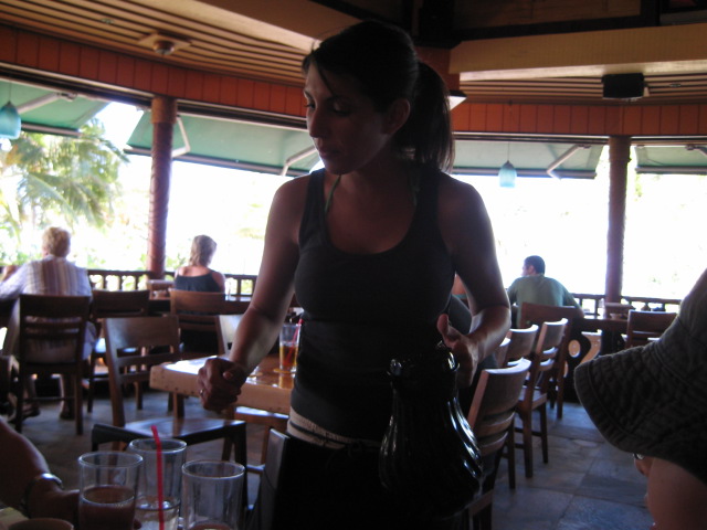 最後にまた行きたかった ルルズ・ワイキキ・サーフクラブへ。 店内はまだ朝7時半頃なんで空いてました。 ホテルは既にチェックアウトしてね。 (写真はクリックすると たぶん大きく、たまにエラーになります) この旅行記5泊7日の話なのに OPツアー編も入れて これでついに50話目です。(^_^;) 最長ですね、なんせ写真350枚くらい 酷使してますからね。 もう3か月前の話なんですがね。 (以前だらだらと半年かけて 旅行記書いたこともあるんで それよりはいいかな) サーフクラブなんで、結構ボード沢山 飾ってますね。 そして最後も当然これ! 巨大ロコモコ。 それとメニュー表(前後しましたね(^_^;)) 安くはないけど、量も多く 大変おいしいですよ! あと1回目の時より 大変感じのいい店員さん!! もう一枚、パチリ。 なかなかの美人さんでしょう!(^◇^) ちょっと影になってしまったけど・・・。 みんなこのタンクトップの制服と半ズボンのパンツですね。 それで、Tシャツとかないのかと お店の中を物色していたら あったんでよ、これ!! 私のは当然オレンジのTシャツ、 妻のサイズ残念なことにオレンジなくて 赤をゲット。私のをうらやましがってました。 着た写真はこの日帰国日なので 羽田での後泊の時にね。 今度はそれを着てお店に行って 「ナイスシャツ!」って言ってもらいたいなぁ。 カラカウア通りに停まってました。 最後のビーチ散策、例の堤防の所へ。 ここ3回ほど、いつもブログ用に 帰国日朝、こんな写真撮りますね。 妻と、妻の母。 これも得意のポーズ、ですね。 この時になると、ほんと 「ああ、帰りたくない・・・」と 思うし、帰りのあの長いフライト考えると ホント憂鬱になりますね。 今度は二人で。前はクヒオビーチ! ほんと帰る日に こんなにハワイアンブルーに なりやがってね。 もう2~3日来るの遅かったらなぁ・・・ってね。 妻の母です。堤防の先ですね。 よくここから飛び込んで行く サーファーいますよね。ほんとは禁止だけど。 次回はその朝のサーファーたちの 写真でーす!!